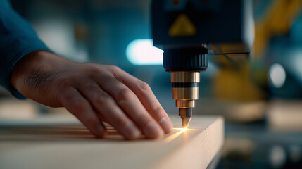 Close-up of a man operating a high-precision laser cutter on a wooden panel in a modern workshop.