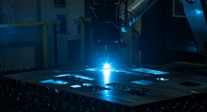 Precision Laser Cutting in Industrial Manufacturing. Advanced laser cutting technology in action, producing intricate designs on metallic surfaces in a high-tech industrial setting.