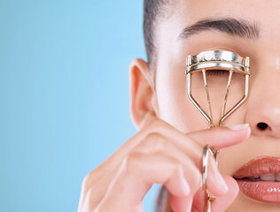 Close-up of young funny woman with pink hair against light background, she holds a sponge in one hand and eyelash curler in the other, copy space, high quality photo