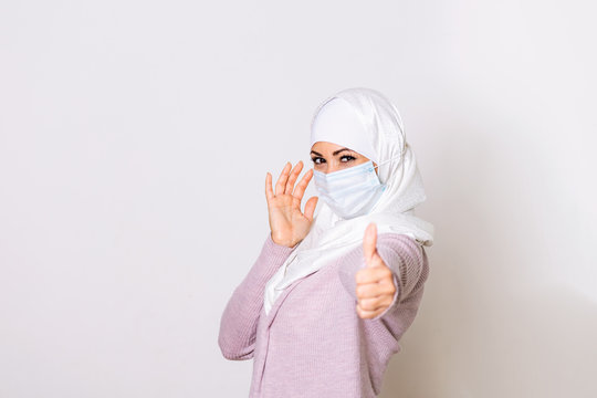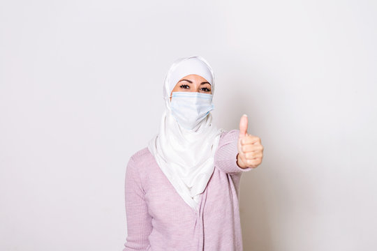 Muslim Woman with protective mask showing thumb up. Woman with face mask in hijab, protection of Coronavirus in human lungs. MERS-CoV, SARS, Adenoviruses and other respiratory viruses