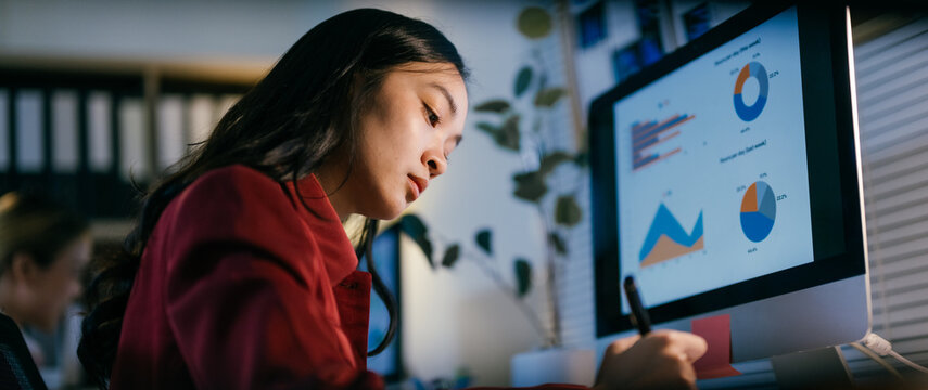 Asian businesswoman concentrated on late-night work in office