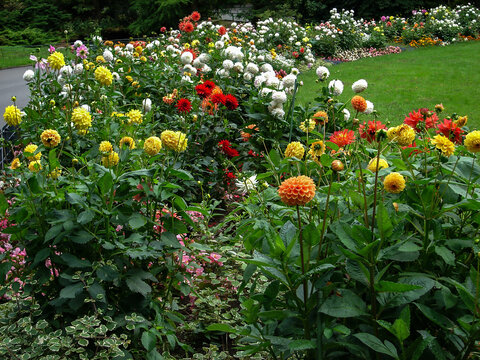 Garden dahlias Dahlia pinnata bloom in a flower bed in late summer. Large beautiful flower bed design