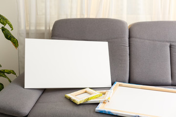 Canvas print. Hand holds a photo with gallery wrap method of canvas stretching on stretcher bar. Sample of stretched color photograph printed on canvas, lateral side, closeup.