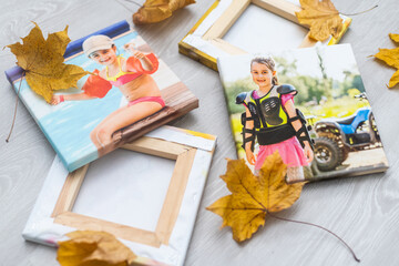 Photography canvas prints. Stacked colorful photos with gallery wrapping method of canvas stretching on stretcher bar, lateral side
