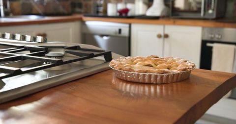 Lattice pie on kitchen counter near stove with teal network overlay, smart kitchen concept