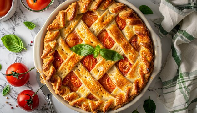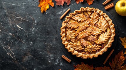 delicious homemade pie with flaky crust filled with sweet apple slices, surrounded by fresh apples and cinnamon sticks, evokes warm, cozy feeling