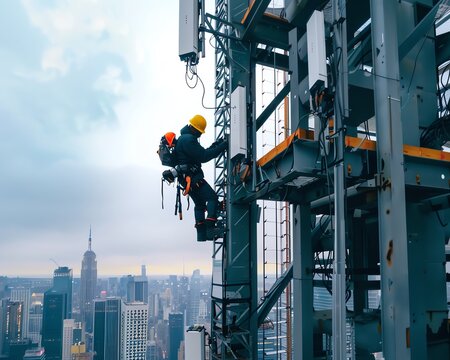Worker with safety gear climbing a high-rise telecommunications tower against a cityscape backdrop with skyscrapers and cloudy sky.