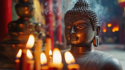 Buddha statue in a temple, with incense sticks and candles lit by monks and devotees during