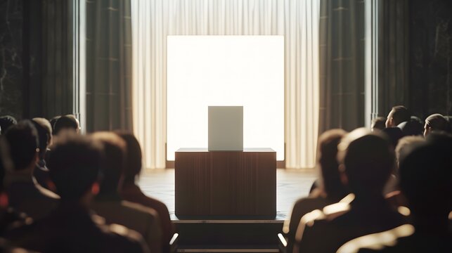 Modern event hall with central led screen and illuminated podiums