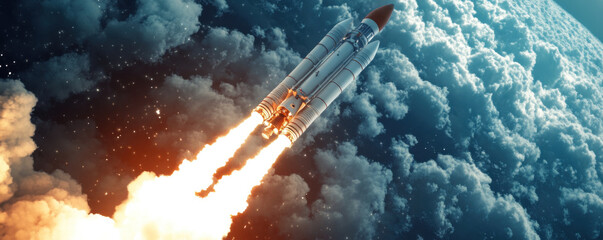 rocket launching into space, surrounded by clouds and stars, symbolizes exploration and innovation. powerful engines ignite, propelling spacecraft toward unknown
