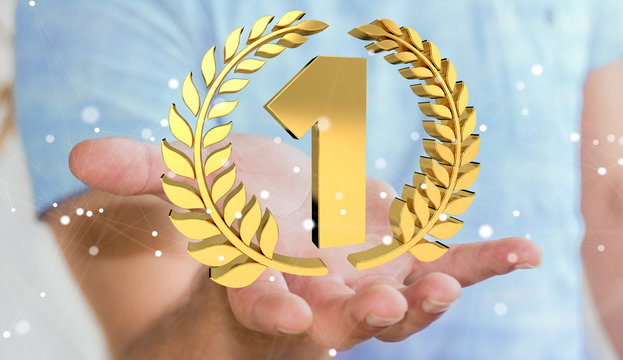Businessman winning the first golden price 3D rendering