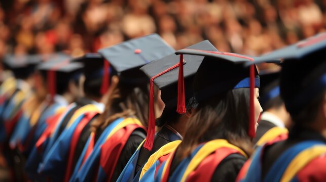 A university graduation ceremony with graduates in caps and gowns, celebrating their achievements