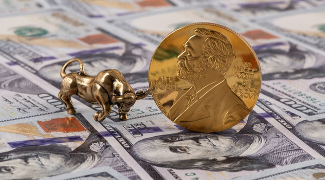 A miniature golden bull and Nobel laureate medal against a backdrop of $100 US bills