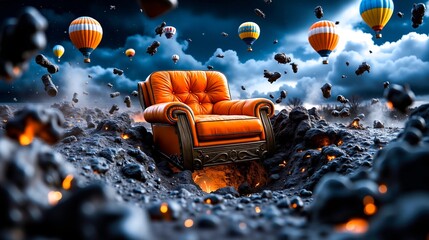 A chair sitting in the middle of a lava field surrounded by hot air balloons
