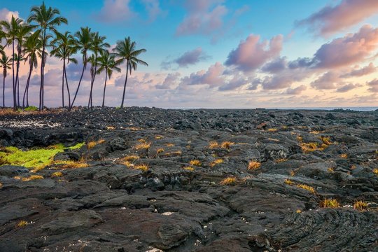 The black lava fields of Pu’uhonua, or the City of Refuge, at Pu’uhonua o Honaunau National Historical Park on the Big Island of Hawaii.
