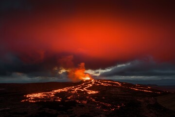 Breathtaking lava flow from erupting volcano under fiery sky