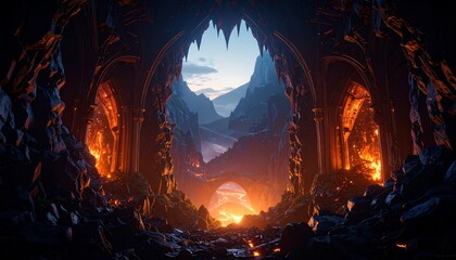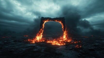 A vivid scene showcasing a burning rock portal surrounded by flowing lava on a dark, stormy landscape, evoking feelings of danger and intrigue. Mystery unfolds.