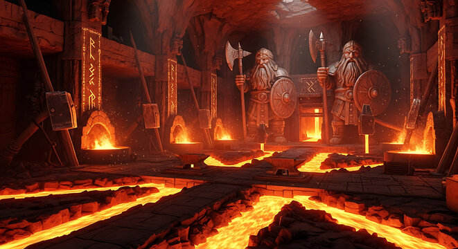 Sparkling river of molten lava on ancient land, paintings of earthy colors, rivers, landscape