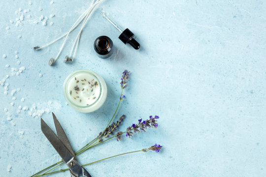 Handmade lavender scented candle with essential oil, flowers, wax, wicks, and scissors, flatlay, shot from above with copy space. An artisanal Christmas gift, zero waste Christmas concept, toned image