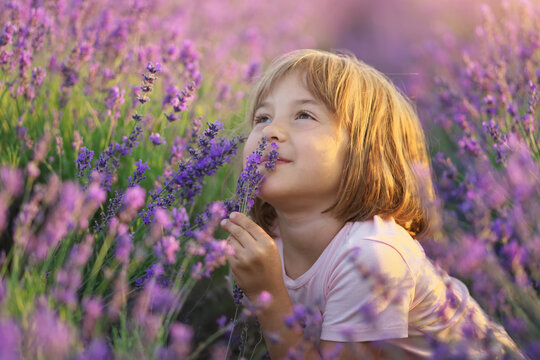 Cute little girl sitting at lavender meadow. Portrait and nature composition.