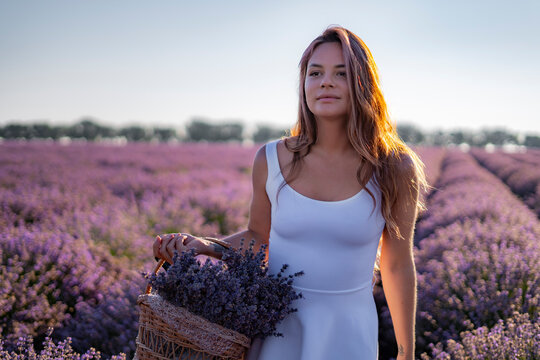 young beautiful attractive lady in white dress  holds a basket with lavender walks on camera in lavender field during sunrise