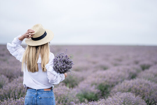 Photo of beautiful young woman in dress holding bouquet with flowers, while walking outdoor through lavender field in summer