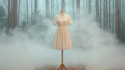 Pale lavender chiffon dress on a mannequin, soft ambient light, whimsical setting with a fairytale castle and misty forest in the background