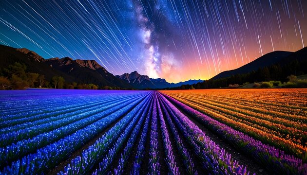 Vibrant rows of lavender under a mystical sunset sky creating an ethereal landscape