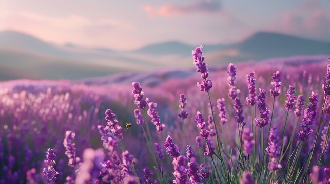 A close-up of a blooming lavender field in the spring, with a bee pollinating the purple flowers and soft hills in the background.