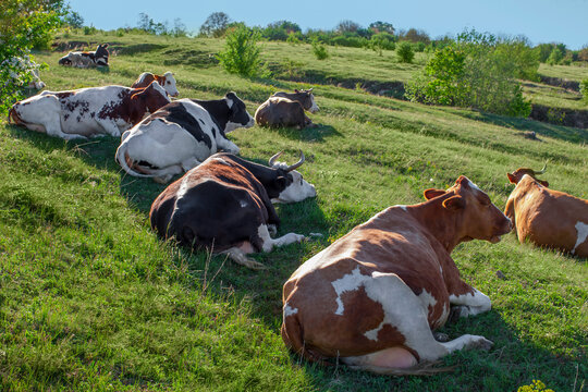 A herd of cows rest on a summer day lying on the green grass on the lusha, among the hills, under the blue sky