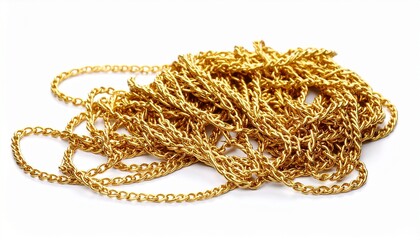 A tangled heap of gold chains made of small, interconnected links, forming a jumbled, intricate mass with a rich, lustrous shine.