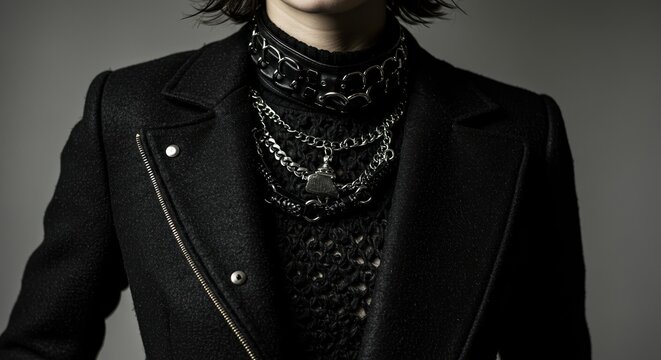 Fashionable Woman in Black Coat with Layered Silver Chains and Leather Choker
