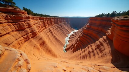 Stunning canyon with layered rock formations and flowing river under clear blue sky