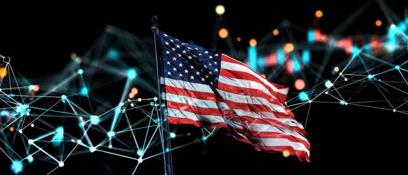 Economic turbulence illustrated: us flag and declining market graphs. Data network. Rippling flag with downward stocks: us economic challenges visualized. Machine learning. Digital web.