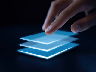 Futuristic glowing layered transparent interface with blue neon light and digital particles creating sleek technology design
