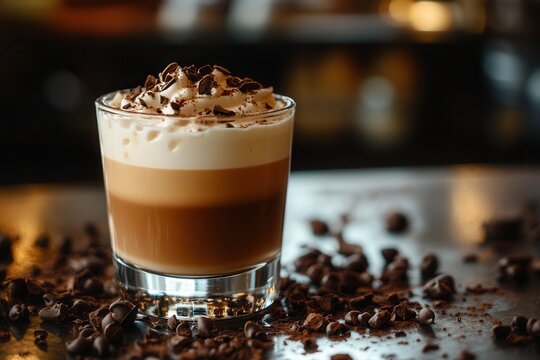 A layered coffee drink with whipped cream and chocolate shavings, surrounded by scattered chocolate pieces on a reflective surface.