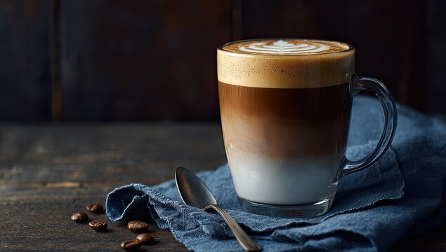 A glass mug of layered coffee drink, latte art