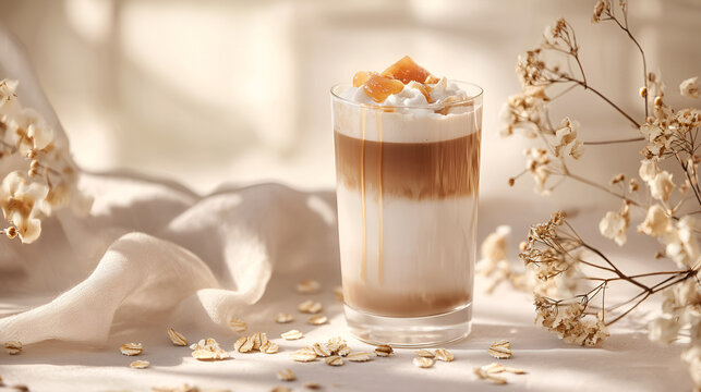 A glass of layered latte with whipped cream and toppings, set against a soft and aesthetically pleasing background.
