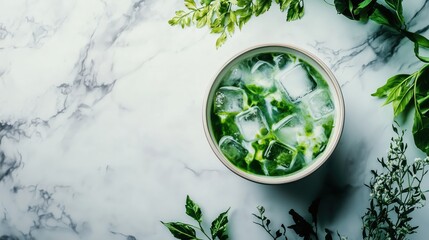 On a marble table, the iced matcha latte glows with its layered green and white hues, while the ice cubes glisten, inviting a cooling sip.