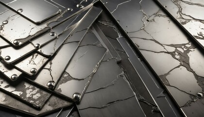 A dramatic abstract texture with layered black metal surfaces, interspersed with rough and rugged patterns, creating a bold and striking visual depth.