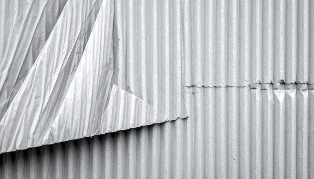 Close-up of a corrugated metal surface with a peeled section revealing layered texture beside intact ridges.