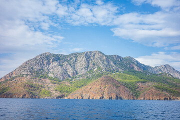A breathtaking coastal landscape featuring rugged rocky mountains covered with lush green forest rising above a calm deep-blue sea. The layered terrain and dramatic cliffs meet the shoreline