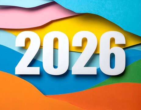 Abstract layered paper cut style background with blue, orange, and white colors.