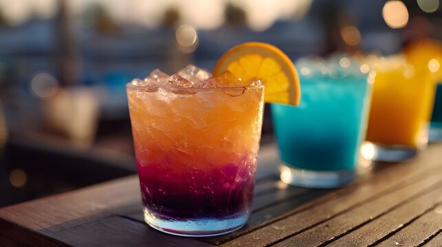 Colorful layered cocktails with ice and orange garnish served on a wooden surface at an outdoor bar during sunset