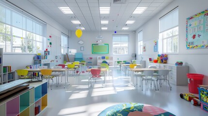 A classroom with desks and chairs, featuring a window, and light, with an empty interior designed for education and meetings, showing a clean, organized floor and furniture