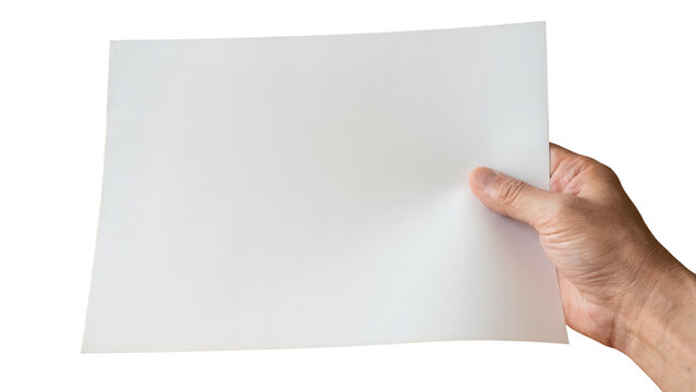 Hand holding blank white sheet of paper isolated on white background