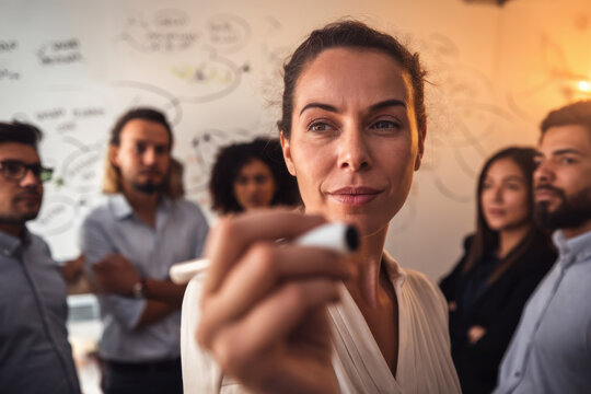 Confident businesswoman leading team collaboration in modern office