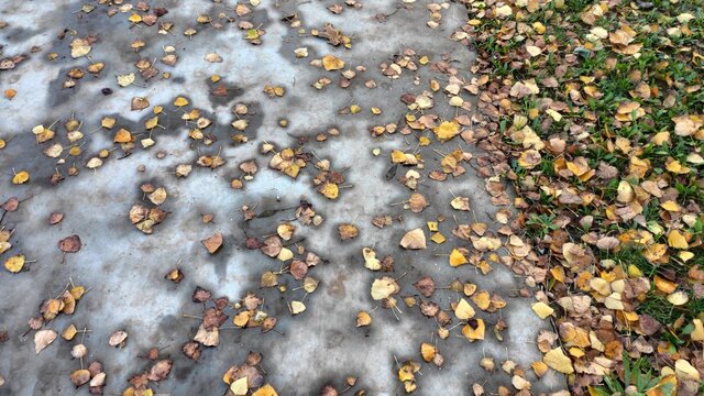 Fallen autumn leaves on wet asphalt after rain