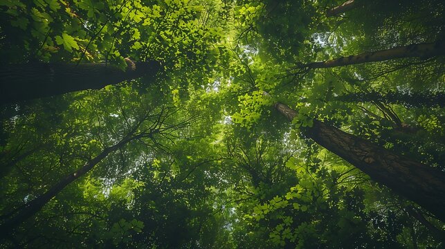 Looking up through green forest canopy with sunlight filtering through leaves. This upward view captures the beauty of nature, tranquility, and environmental freshness.