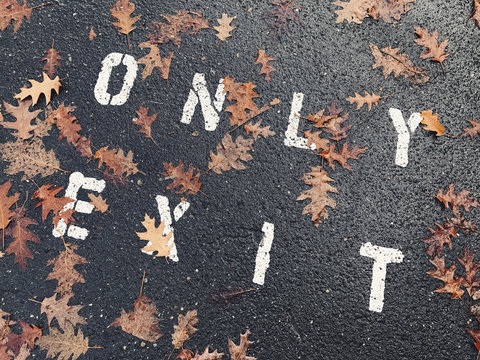 ONLY EXIT warning on street with fallen autumn leaves